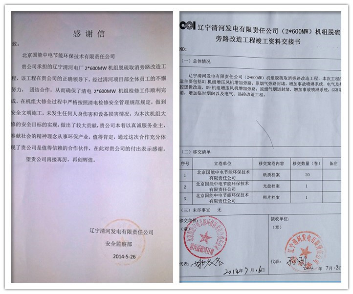 在公司總部的正確領(lǐng)導(dǎo)下,經(jīng)過清河EPC旁路改造項(xiàng)目部全體成員的共同努力,7月18日,遼寧清河發(fā)電有限責(zé)任公司業(yè)主代表在竣工資料交接證書上簽字,標(biāo)志著我公司承擔(dān)的遼寧清河電廠2*600MW機(jī)組脫硫取消旁路改造工程正式竣工驗(yàn)收,成功打響了我司在中國電力投資集團(tuán)的第一槍。